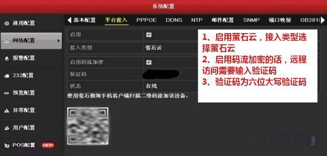通道添加完成后,初始化硬盘,录像设置,在录像机菜单—录像配置—计划配置界面,选择定时录像,默认情况是24小时全天录像。设置完成进行远程设置,进入录像机主菜单—系统配置—网络配置—平台接入,启用"萤石云"打钩,状态显示在线,手机萤石云APP扫描二维码绑定添加,输入设备验证码即可绑定成功,可手机在线远程观看。