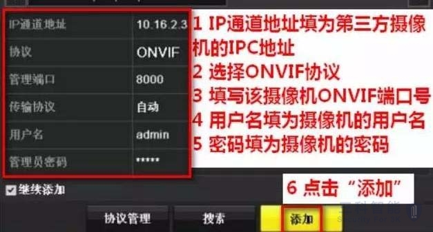 在录像主机主菜单-通道管理-IP通道界面,选择自定义添加,填写摄像头的ip地址,选择ONVIF协议,填写摄像头厂家端口,填写摄像机密码,无密码的,需先设置密码添加。
